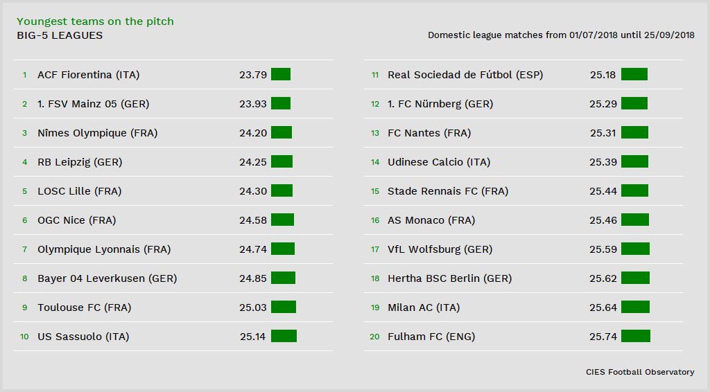 Najmłodszym zespołem w Euopie jest Fiorentina z przeciętną wieku 23.79.